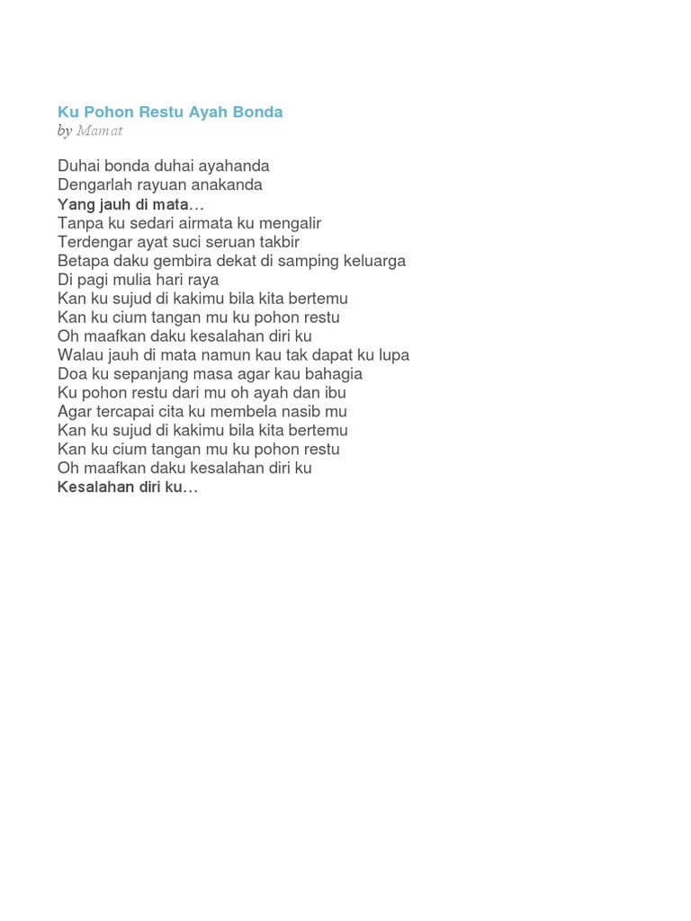 Dari jauh kupohonkan ampun maaf. Rumah itu rumah Haji Abu. Ulang korus Restu ayah bonda kuharap selalu.